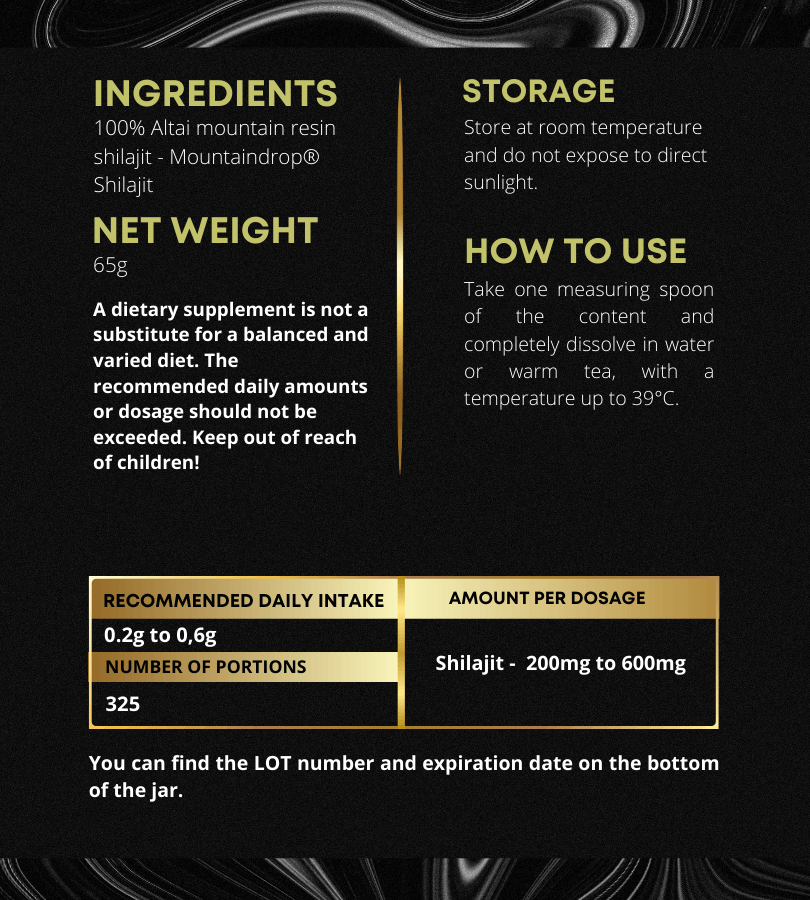 Shilajit is a rare herbomineral resinous substance found in the mountain regions of Tibet, the Himalayas, the Caucasus and the Altai Mountains in southern. It has an intense black color and a viscous texture. Shilajit has been formed by nature after a process that lasted thousands of years. It is a powerful biostimulant and energy booster that can improve your physical and mental strength, enhance libido and brain function, promote recovery and much more!