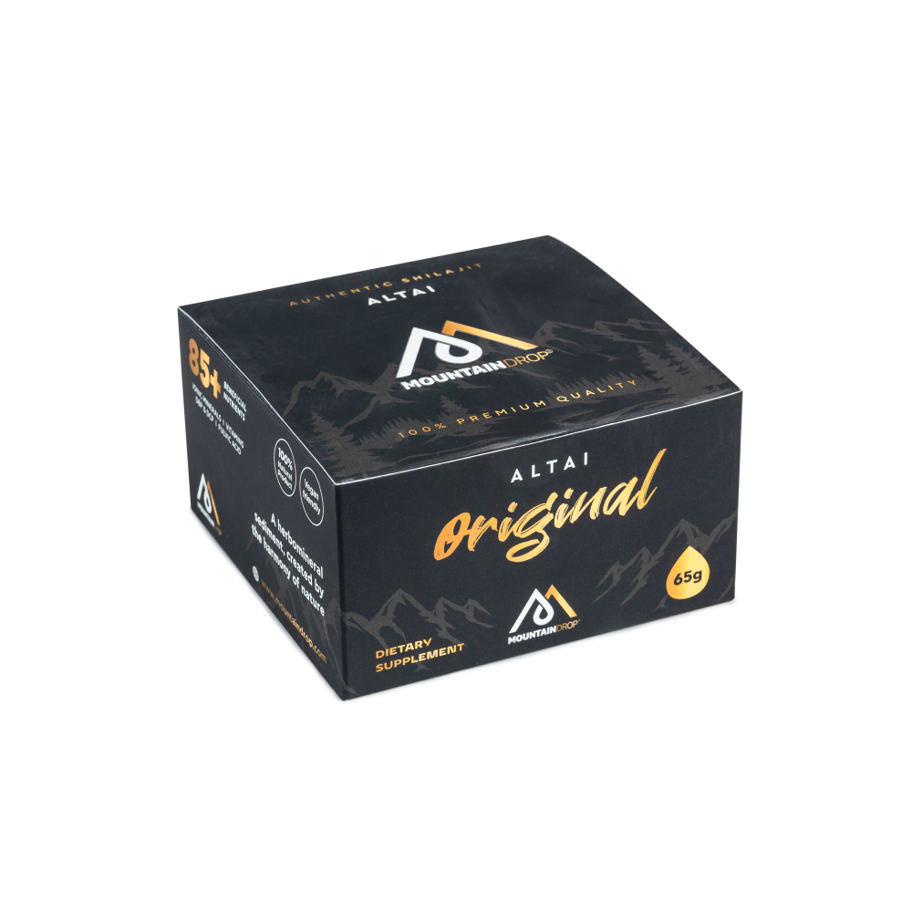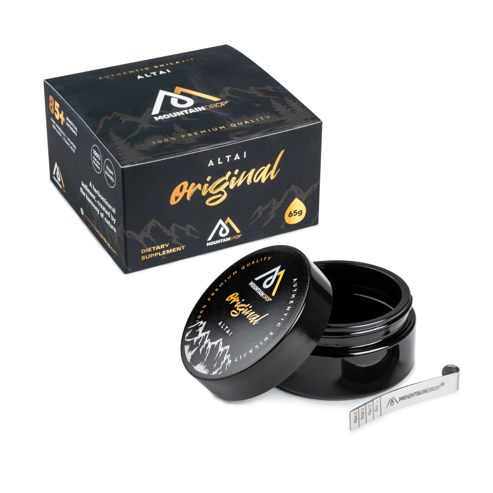 Reach your optimum physical and cognitive state with an all-natural and powerful herbomineral. Mountaindrop® Original Altai shilajit fires up your day with more than 85 beneficial nutrients including ionic minerals, vitamins, amino acids and phospholipids allowing you to perform mentally and physically at your highest level! Enhance your life by absorbing all the essentials that your body and mind need to perform at their maximum capacity! Our Original Altai shilajit is lovingly hand-harvested from the Altai mountains at an altitude range of 3000 to 5000 meters. It has a deep black color, sticky texture and an intense taste and smell. It is stored in a unique violet glass container with biophotonic properties that preserves the resin in its original authentic and pure form!